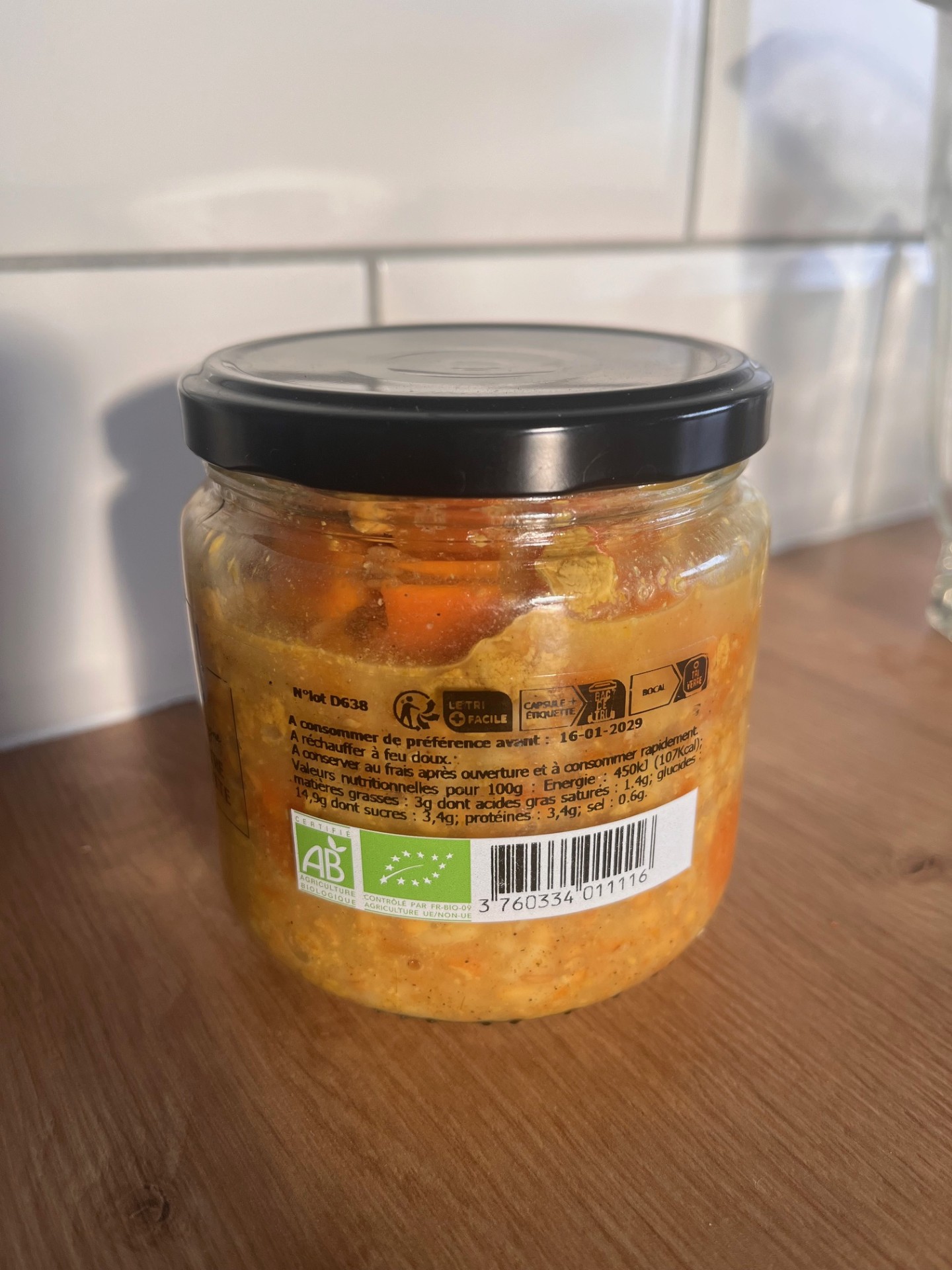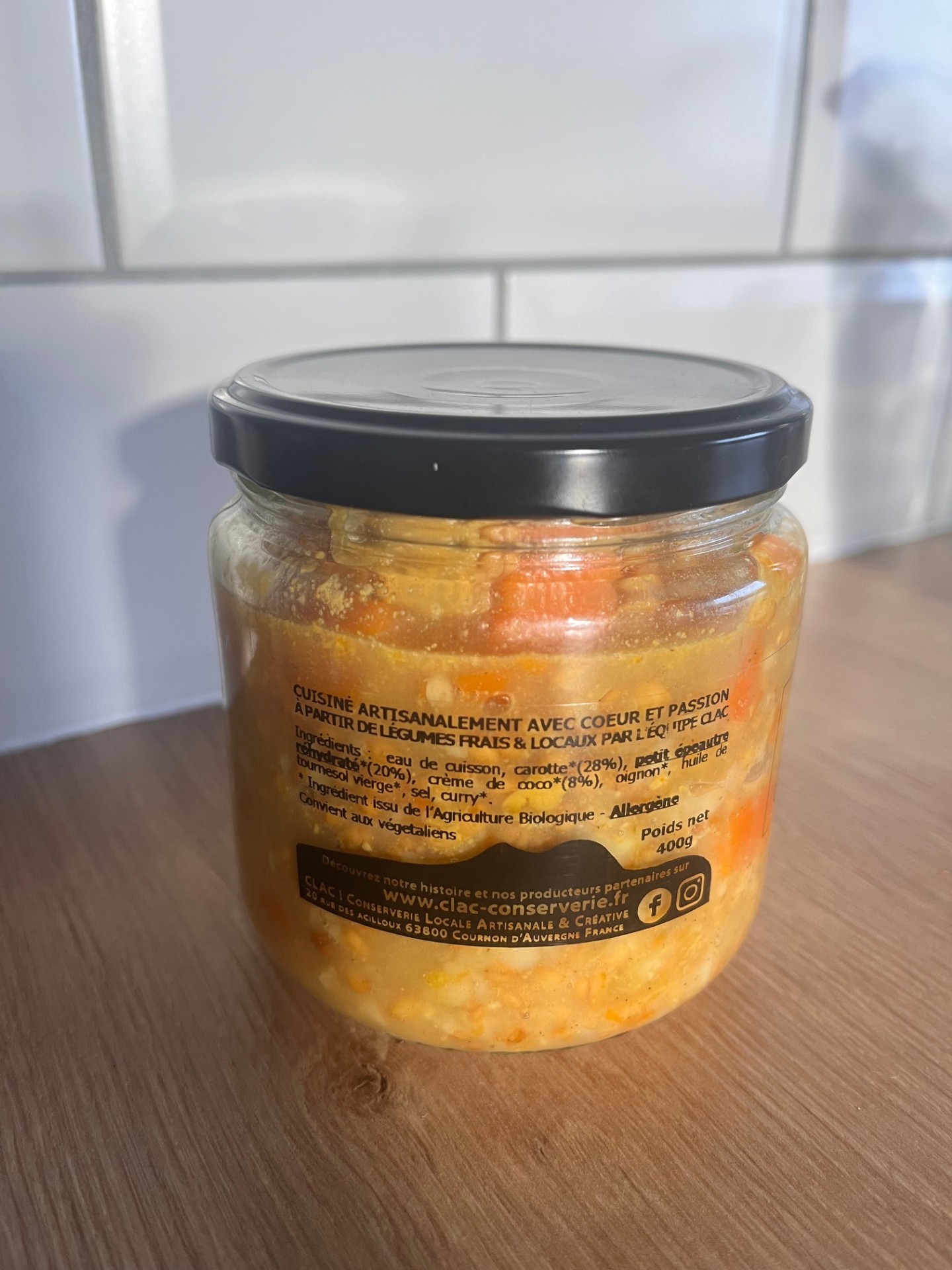 Ingrédients : eau de cuisson, carotte*, petit épeautre réhydraté*, crème de coco*, oignon*, huile de tournesol vierge*, sel, curry*