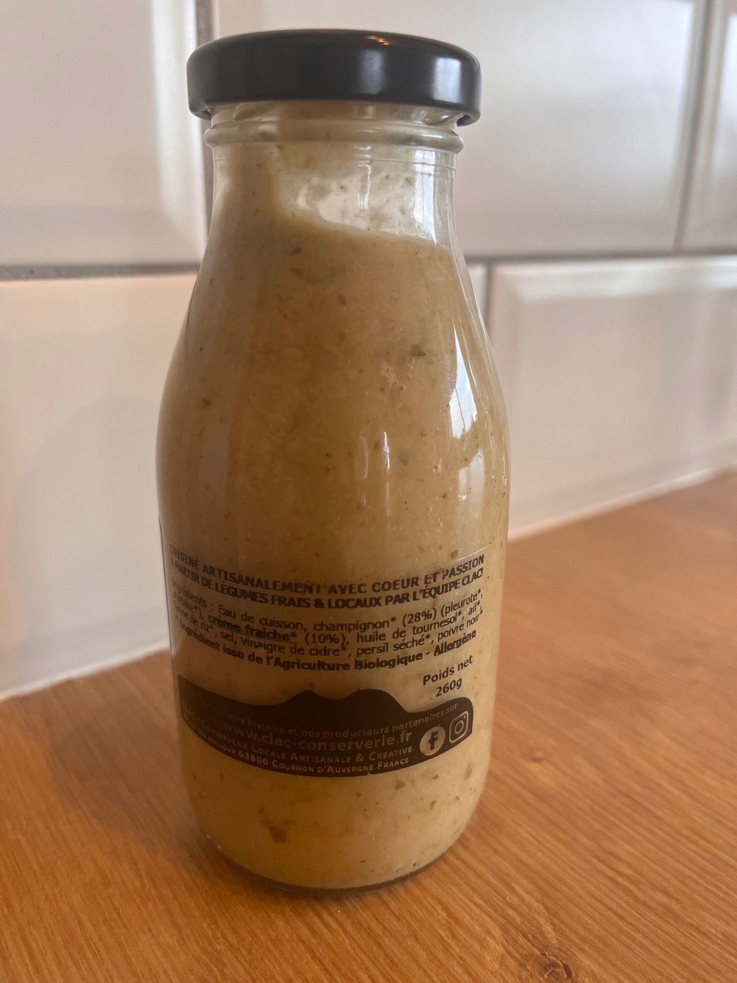 Ingrédients : eau de cuisson, champignon* (28%) (pleurote* et shiitaké*), crème fraiche* (10%), huile de tournesol*, ail*, farine de riz*, sel, vinaigre de cidre*, persil séché*, poivre noir*.